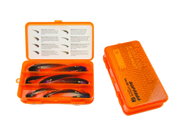 Big black flies with good silhouette! Flies that have proven to be our best night flies, presented in our Classic Double SALAR Supreme box.